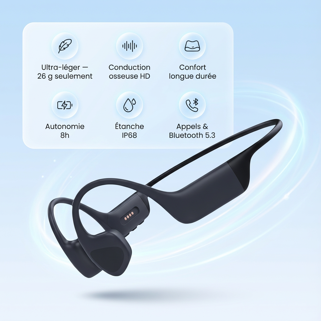 Conduction osseuse • Oreilles libres • Étanche eau & sueur • Ultra confort